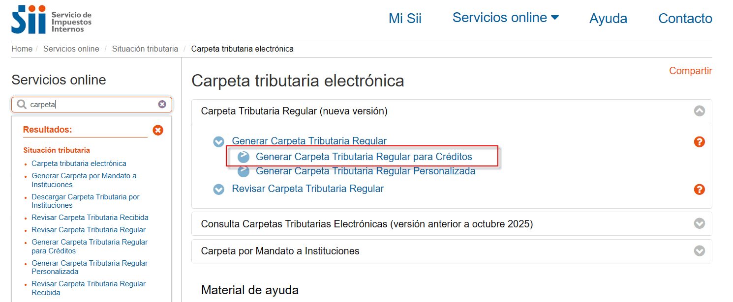 Carpeta tributaria electrónica → Carpeta Tributaria Regular (nueva versión) → Generar Carpeta Tributaria Regular → Carpeta Tributaria Regular para Créditos.
