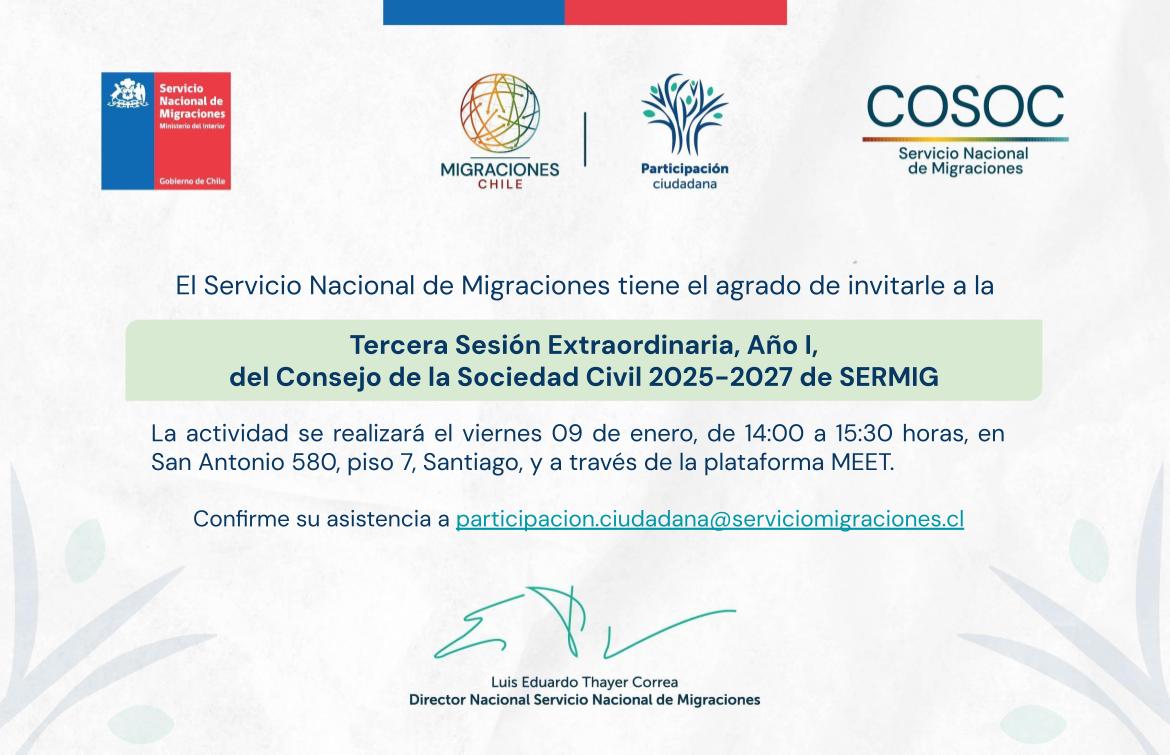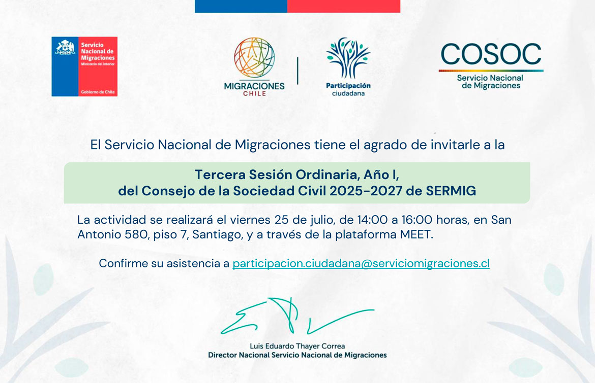 El Consejo de la Sociedad Civil (COSOC) del Servicio Nacional de Migraciones (SERMIG) es un ente autónomo que tiene por objeto el análisis y discusión de la sociedad civil respecto a las migraciones en Chile, en las materias de competencia de SERMIG, integrando a las principales decisiones de la autoridad un enfoque intercultural y de participación ciudadana, con pleno respeto de la diversidad social y cultural de las comunidades migrantes y refugiadas y de las organizaciones que promueven sus derechos y deberes.